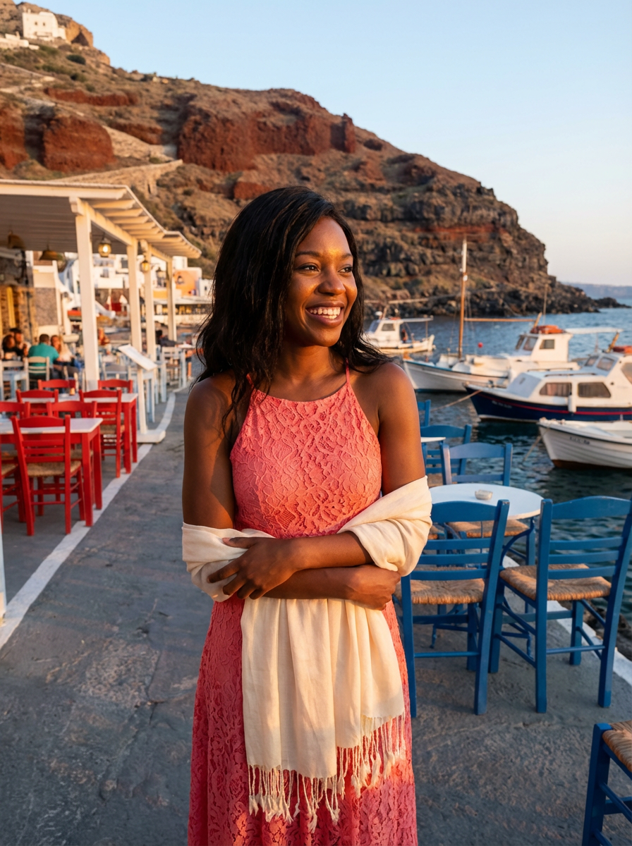 model enjoying sunset at Amoudi Bay, wearing a romantic evening dress with light scarf , golden hour lighting on seaside tavernas