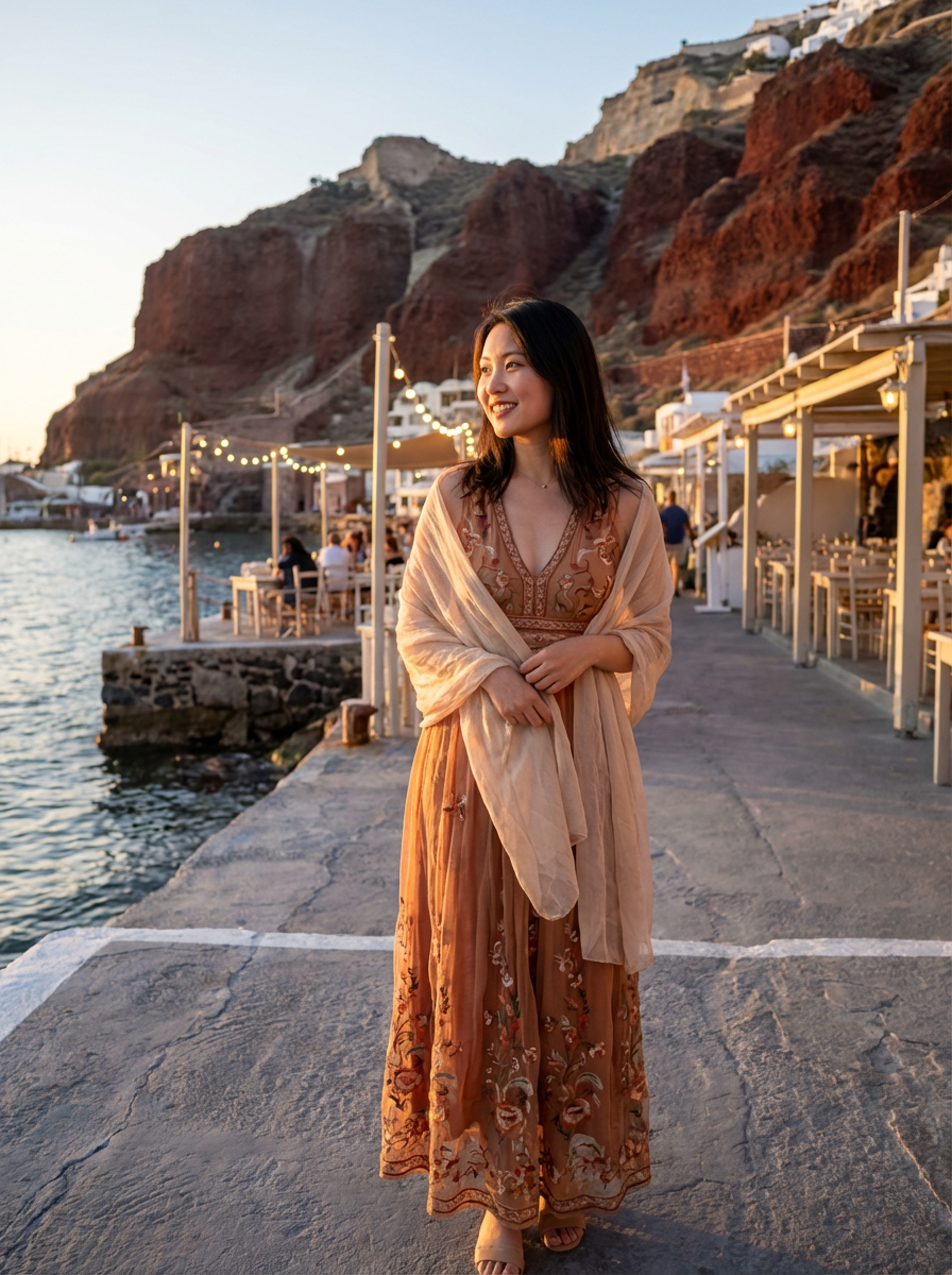model enjoying sunset at Amoudi Bay, wearing a romantic evening dress with light scarf , golden hour lighting on seaside tavernas