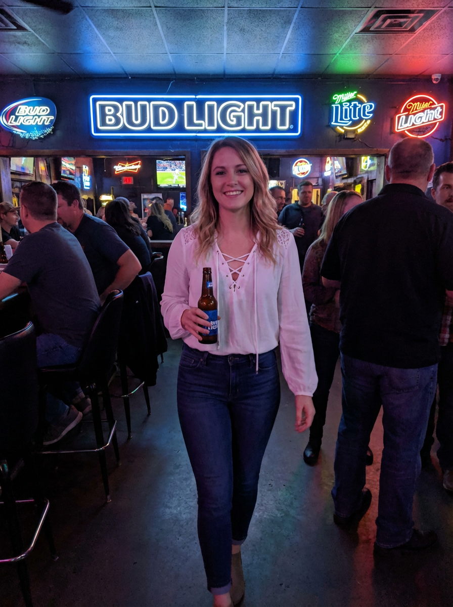 model exploring a lively dive bar in Las Vegas. at night. neon sign says "BUD LIGHT". the model sports a casual yet trendy outfit, such as a stylish blouse and jeans.