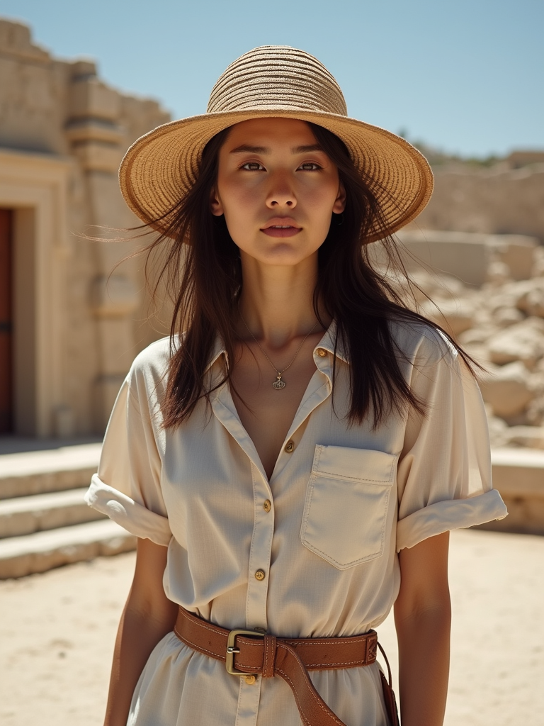 model exploring ancient Akrotiri ruins, wearing a comfortable stylish outfit with hat , archaeological wonders visible