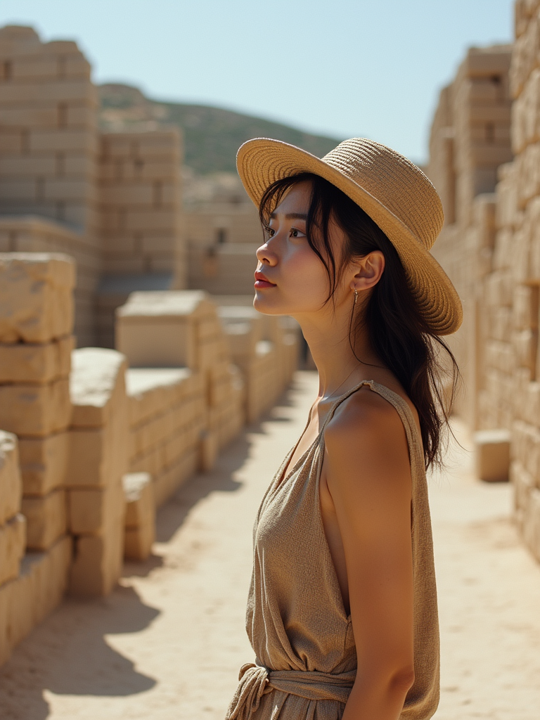 model exploring ancient Akrotiri ruins, wearing a comfortable stylish outfit with hat , archaeological wonders visible