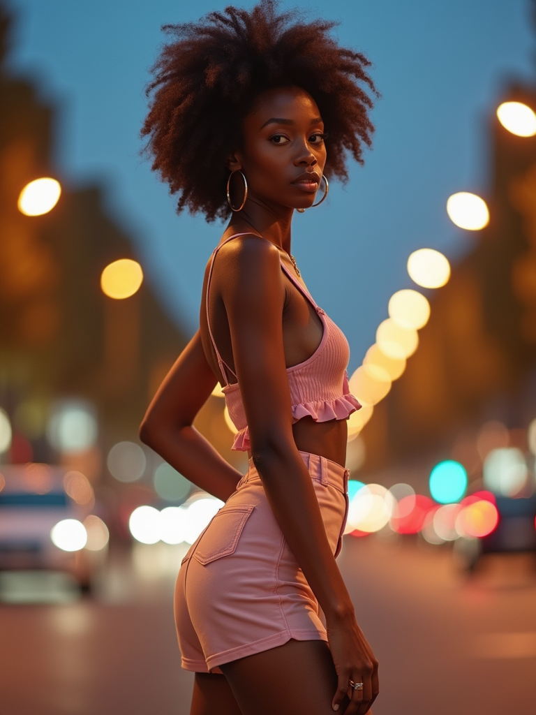 model exploring Champs-Élysées, wearing a cute pastel outfit with platform sandals , surrounded by city lights