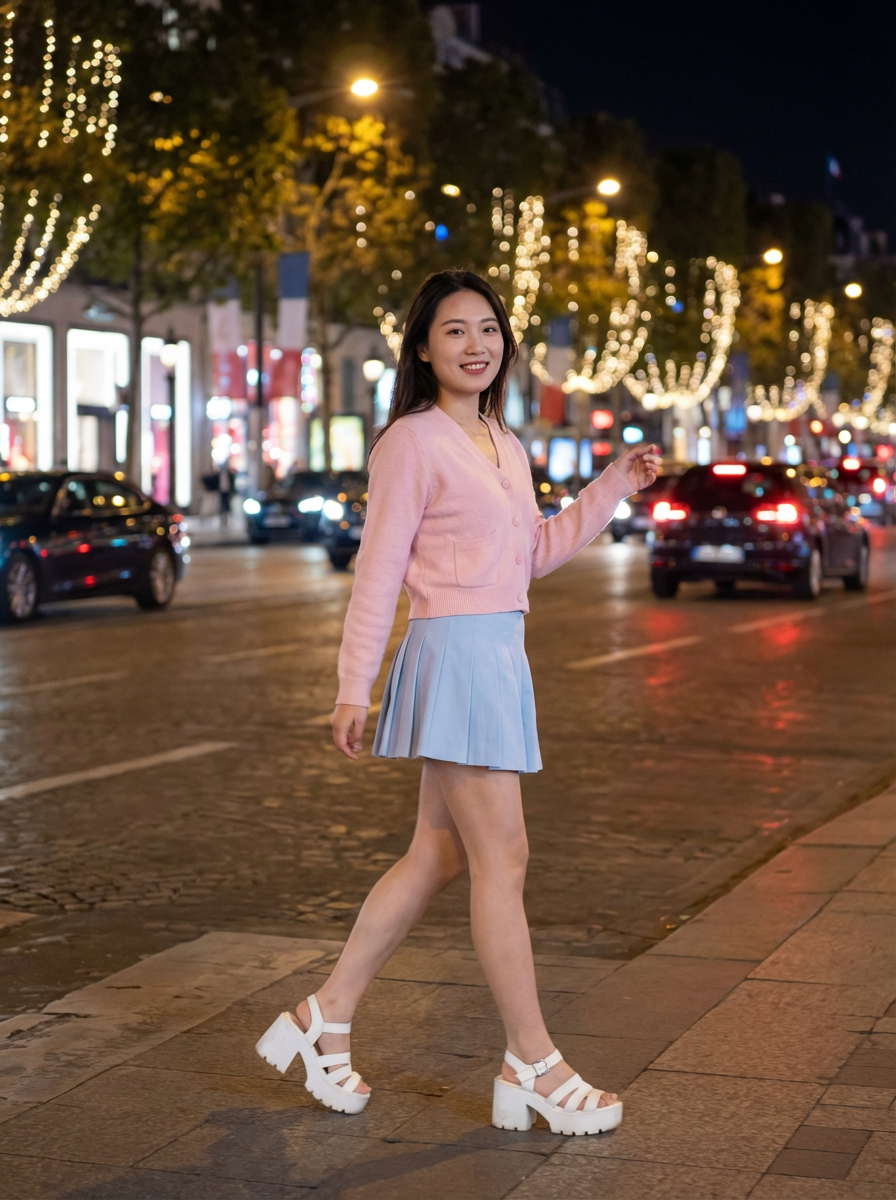 model exploring Champs-Élysées, wearing a cute pastel outfit with platform sandals , surrounded by city lights