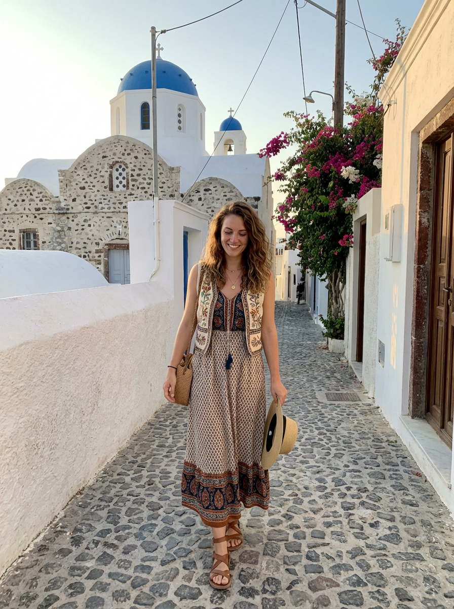 model exploring narrow streets of Pyrgos village, wearing a bohemian summer outfit with sandals , traditional Greek architecture