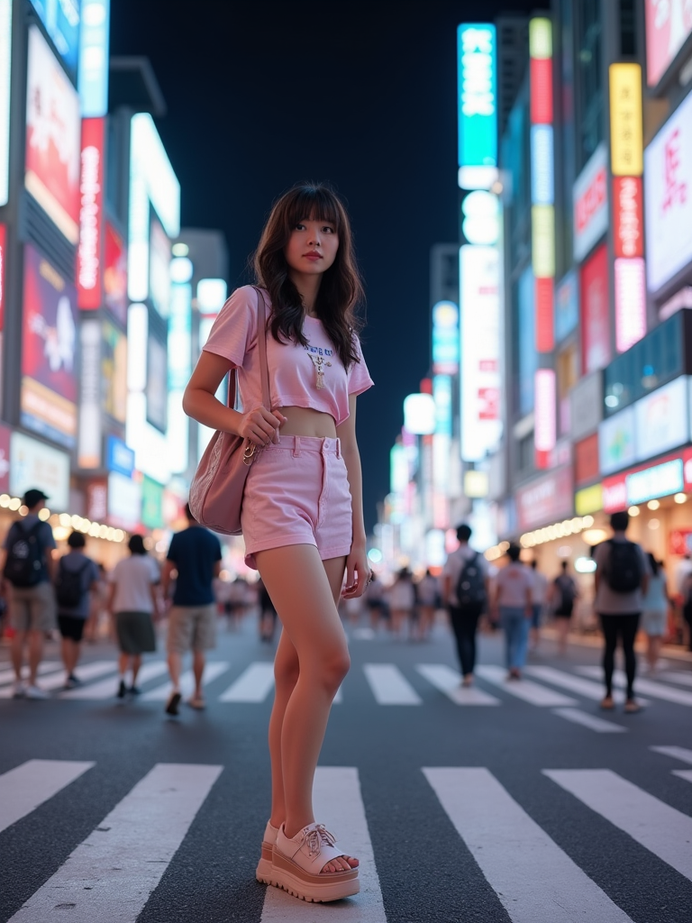 model exploring Shibuya Crossing, wearing a cute pastel outfit with platform sandals , surrounded by neon lights