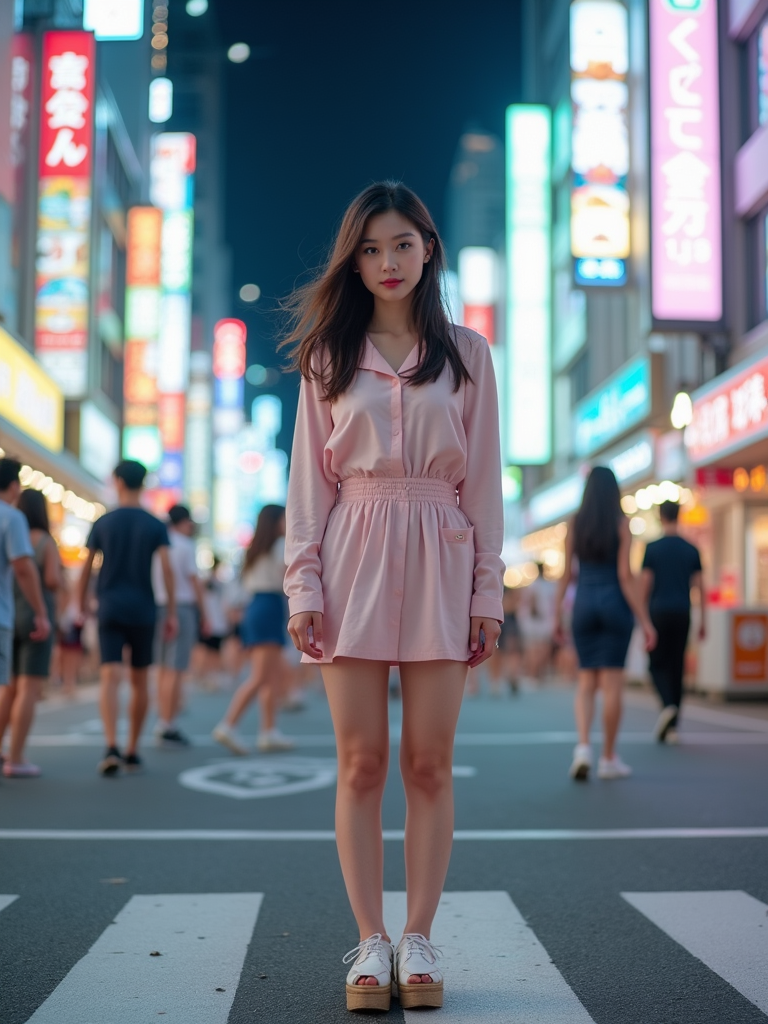 model exploring Shibuya Crossing, wearing a cute pastel outfit with platform sandals , surrounded by neon lights