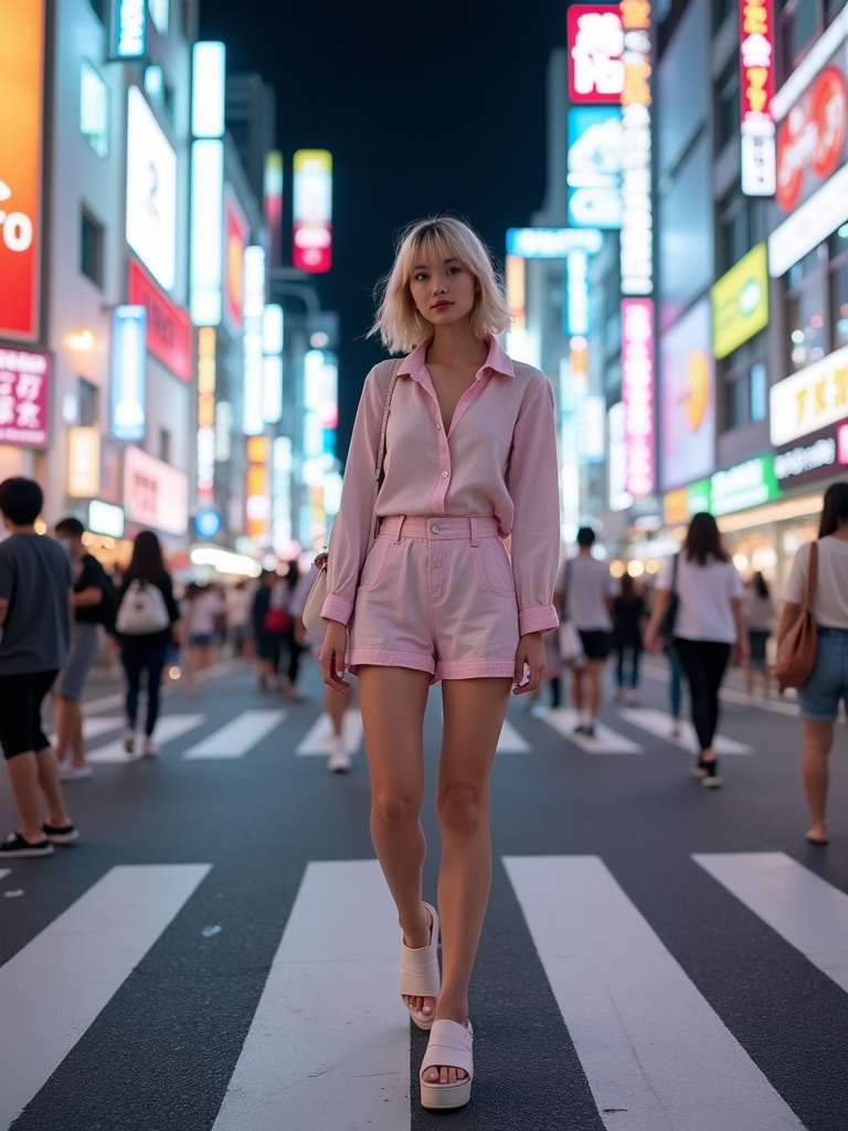 model exploring Shibuya Crossing, wearing a cute pastel outfit with platform sandals , surrounded by neon lights