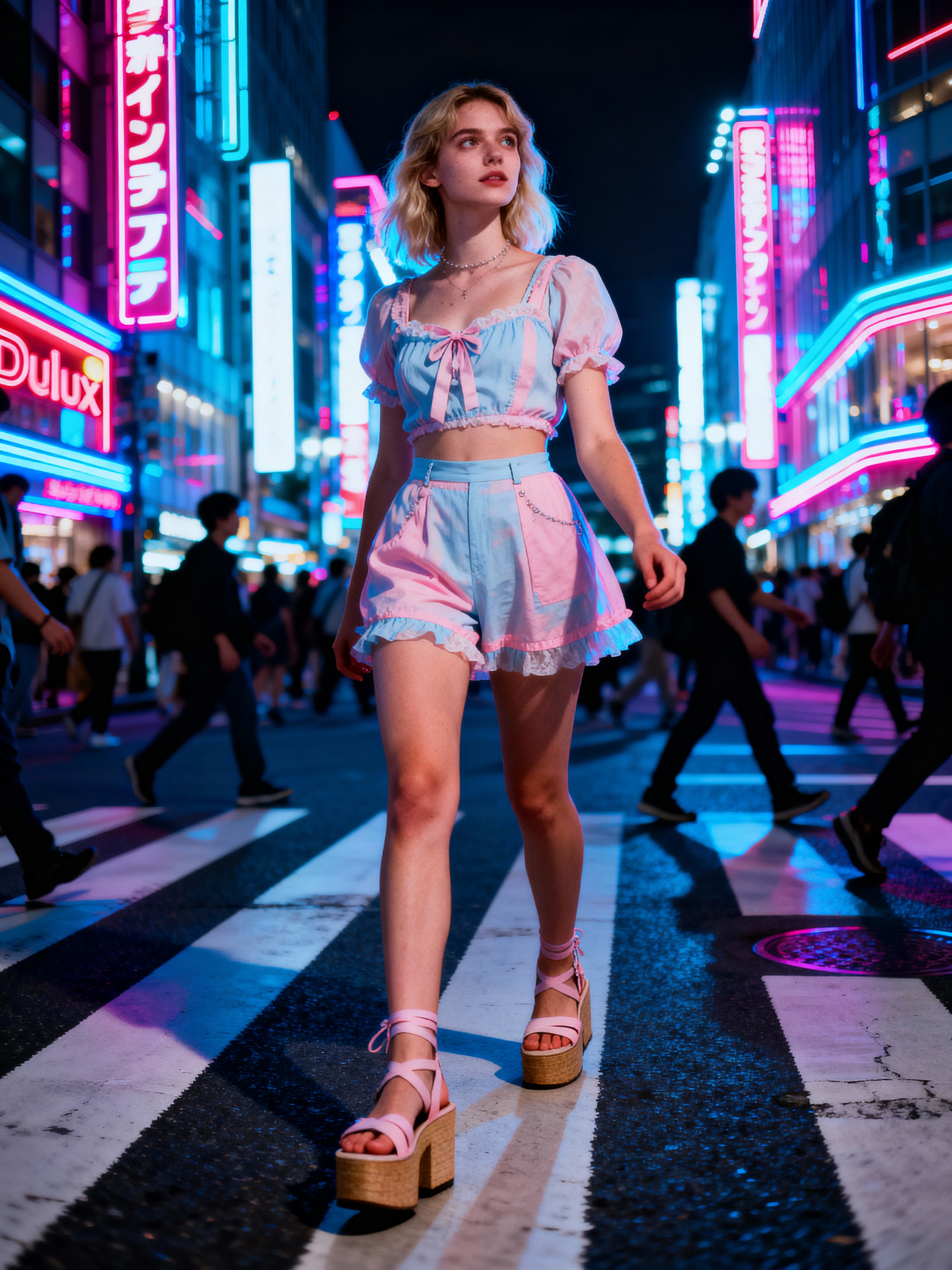 model exploring Shibuya Crossing, wearing a cute pastel outfit with platform sandals , surrounded by neon lights
