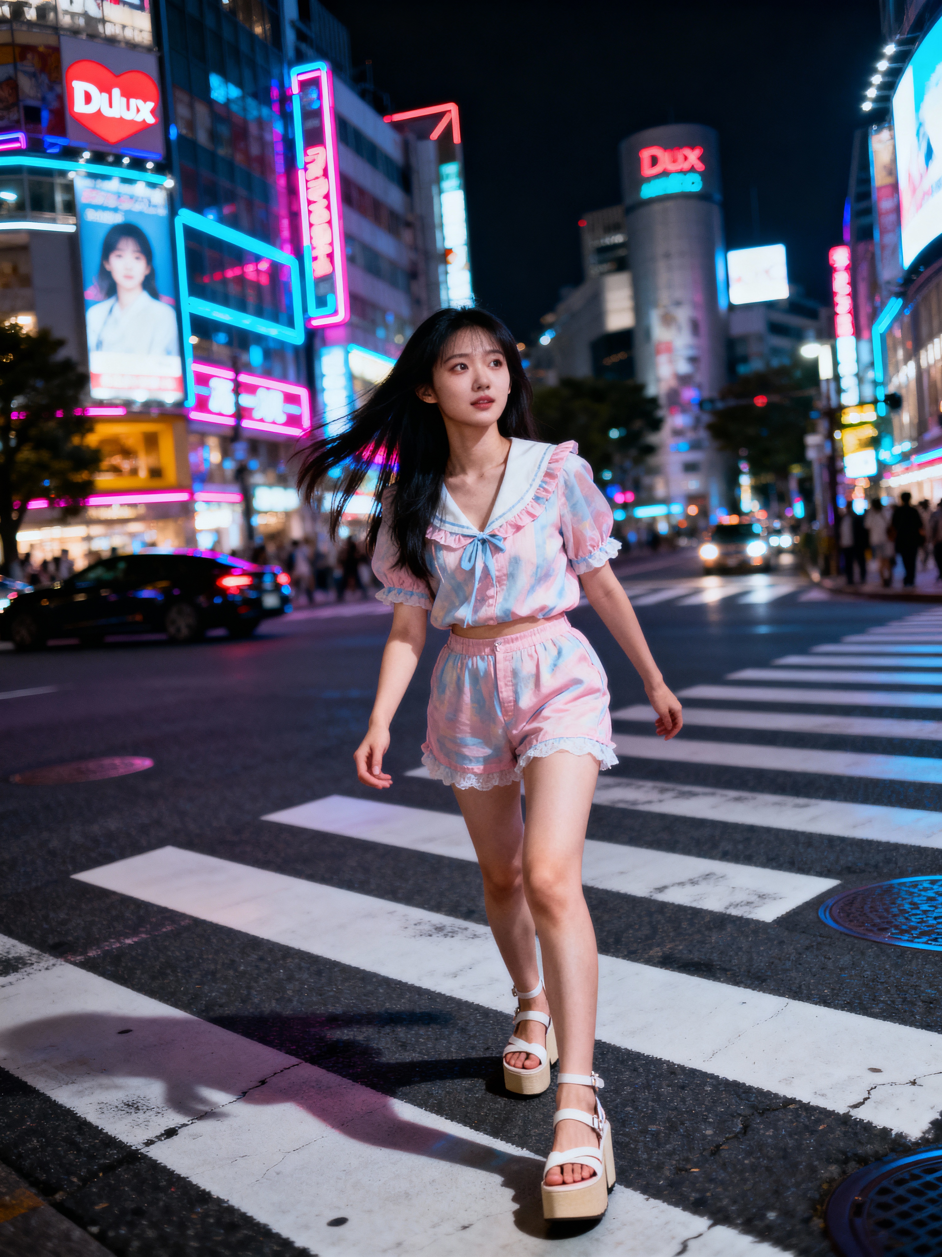 model exploring Shibuya Crossing, wearing a cute pastel outfit with platform sandals , surrounded by neon lights