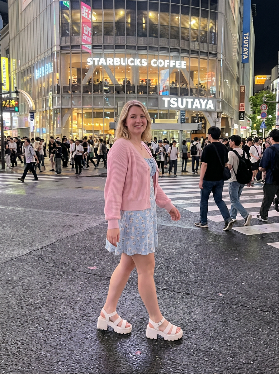model exploring Shibuya Crossing, wearing a cute pastel outfit with platform sandals , surrounded by neon lights