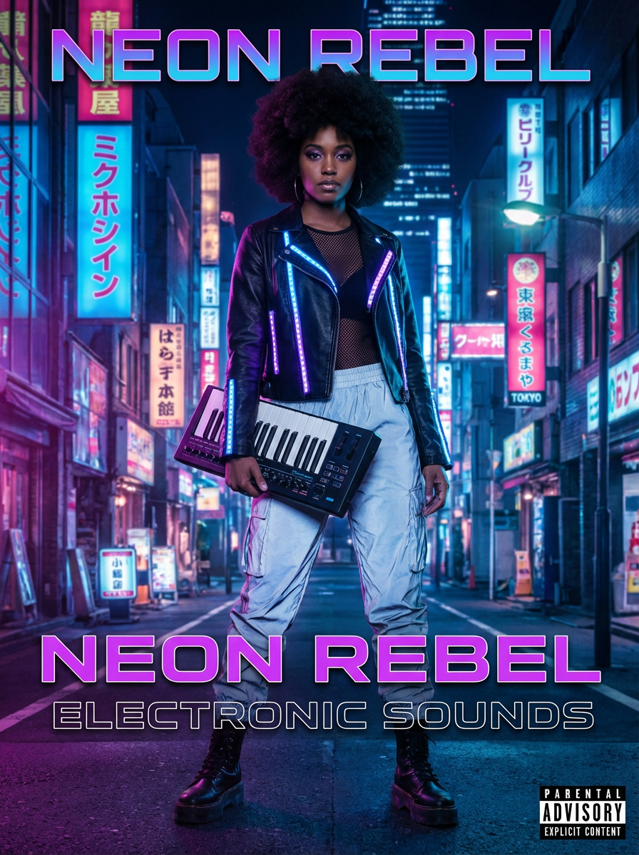 model for electronic music cover, futuristic aesthetic, neon lights, cyberpunk influence, modern edgy