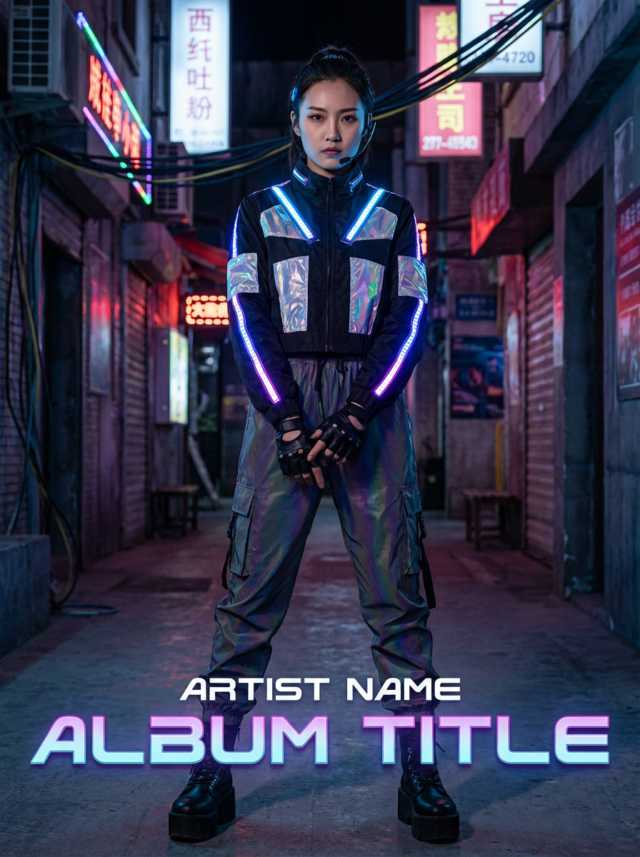 model for electronic music cover, futuristic aesthetic, neon lights, cyberpunk influence, modern edgy