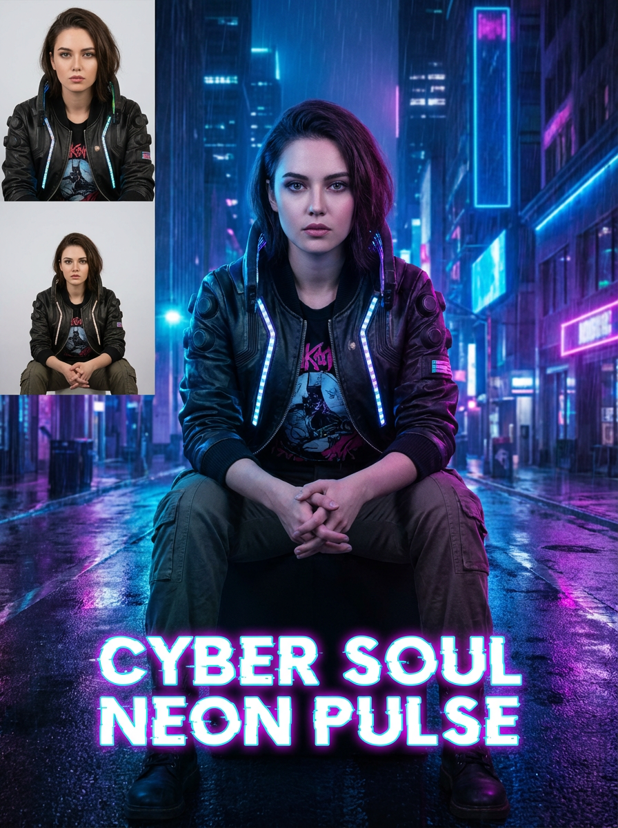 model for electronic music cover, futuristic aesthetic, neon lights, cyberpunk influence, modern edgy
