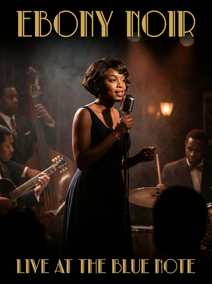 model for jazz album cover, sophisticated noir aesthetic, smoky club vibe, classic timeless style