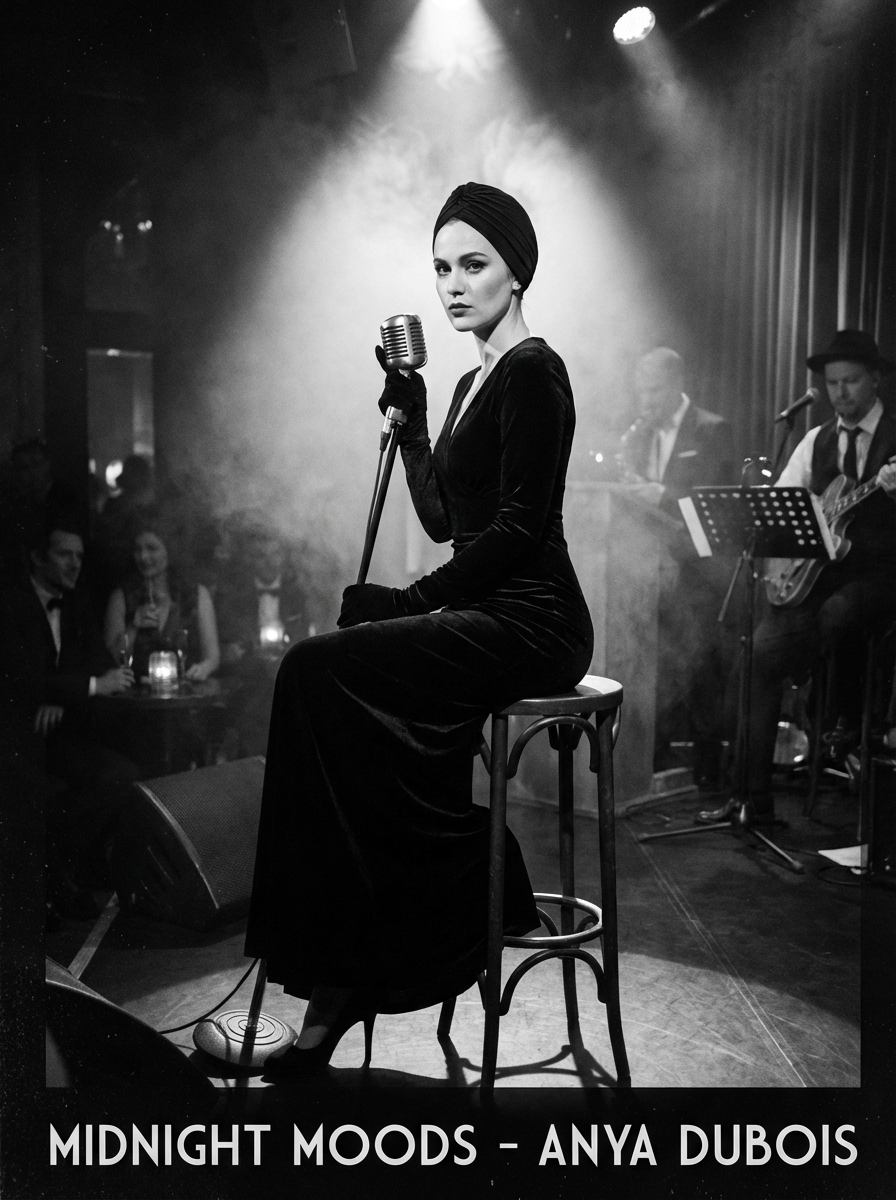 model for jazz album cover, sophisticated noir aesthetic, smoky club vibe, classic timeless style