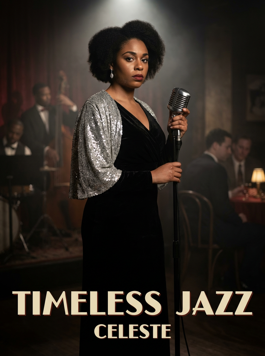 model for jazz album cover, sophisticated noir aesthetic, smoky club vibe, classic timeless style
