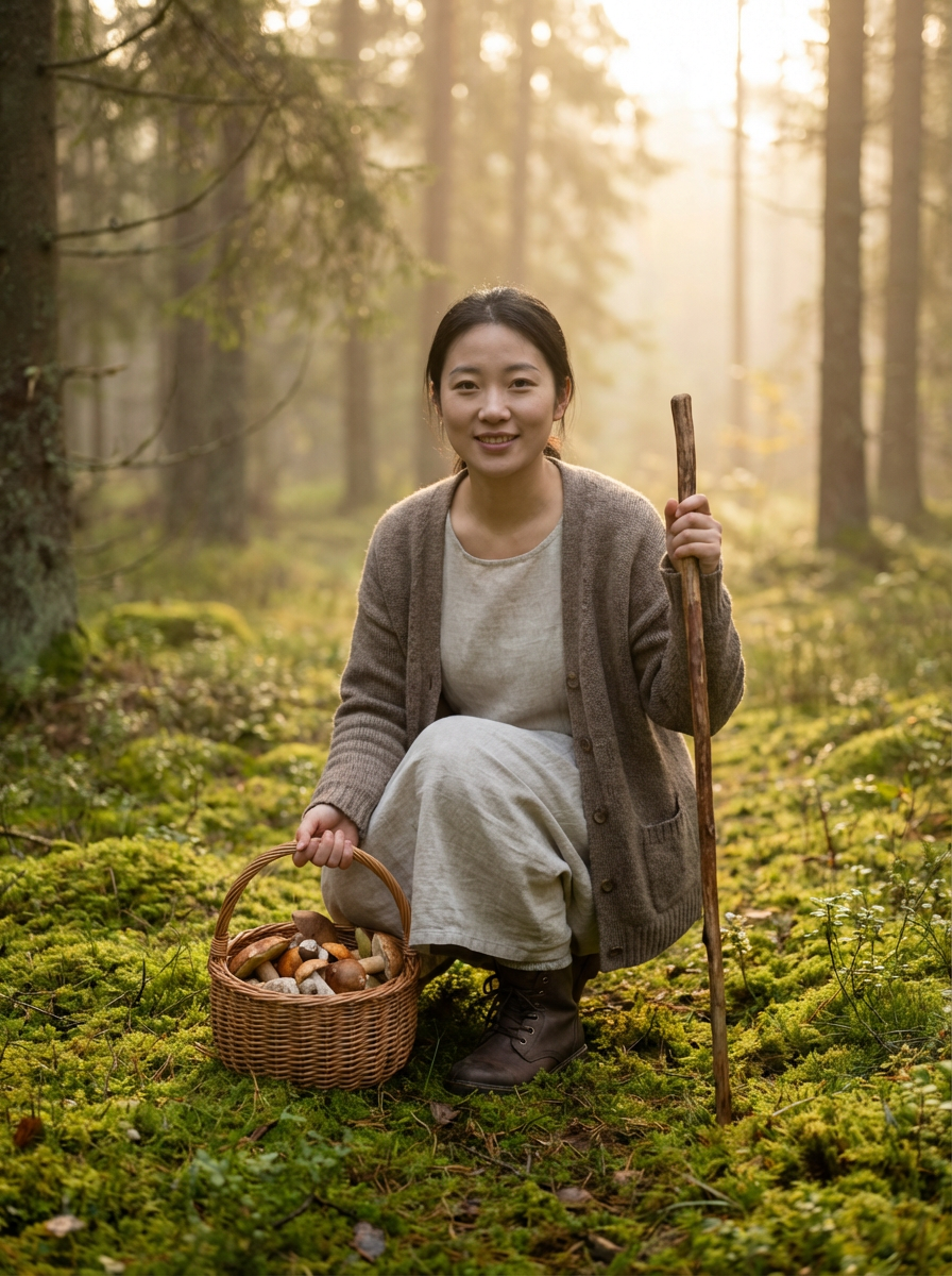 model foraging mushrooms, cottagecore aesthetic, basket and walking stick, misty forest morning
