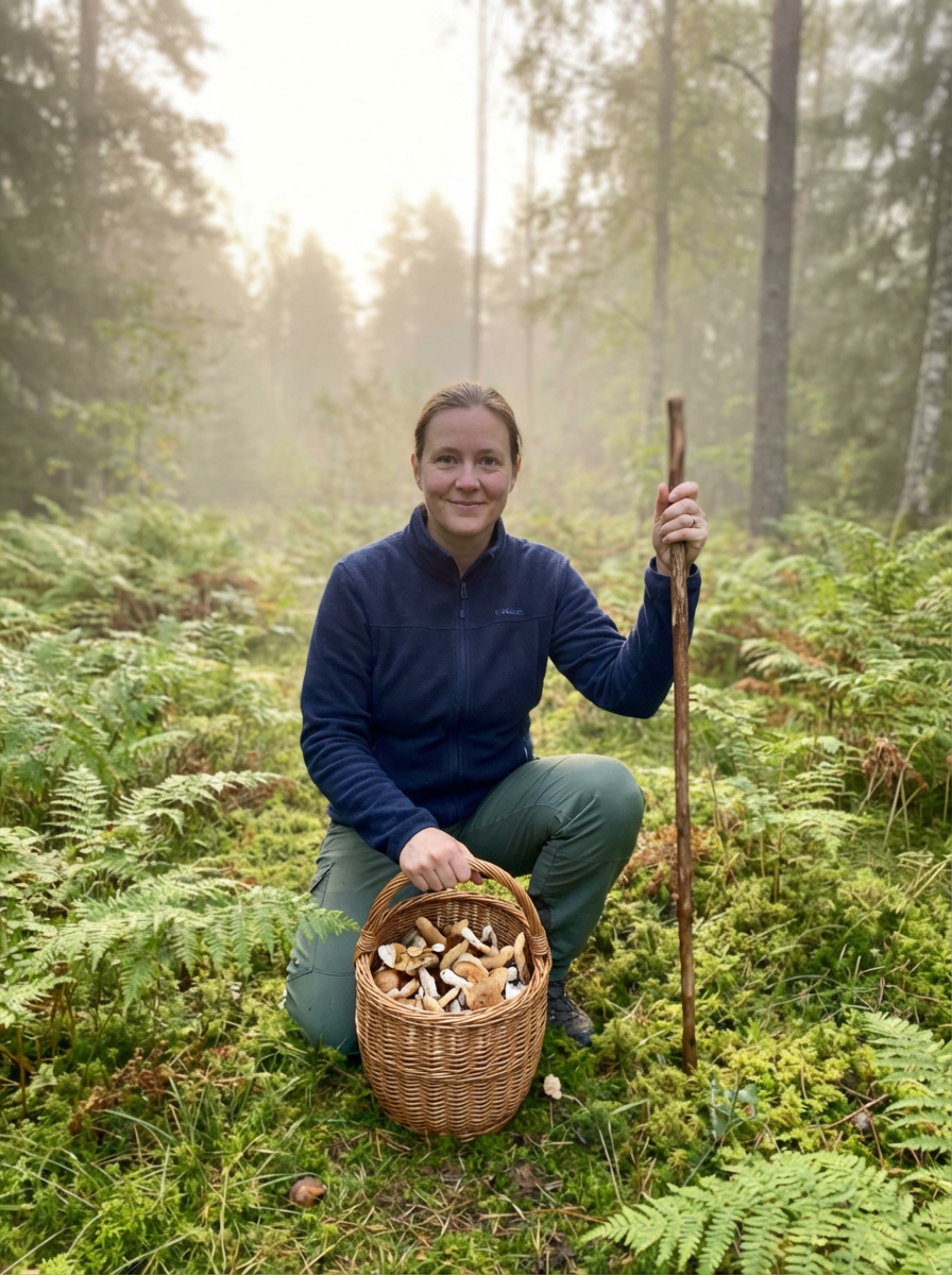 model foraging mushrooms, cottagecore aesthetic, basket and walking stick, misty forest morning