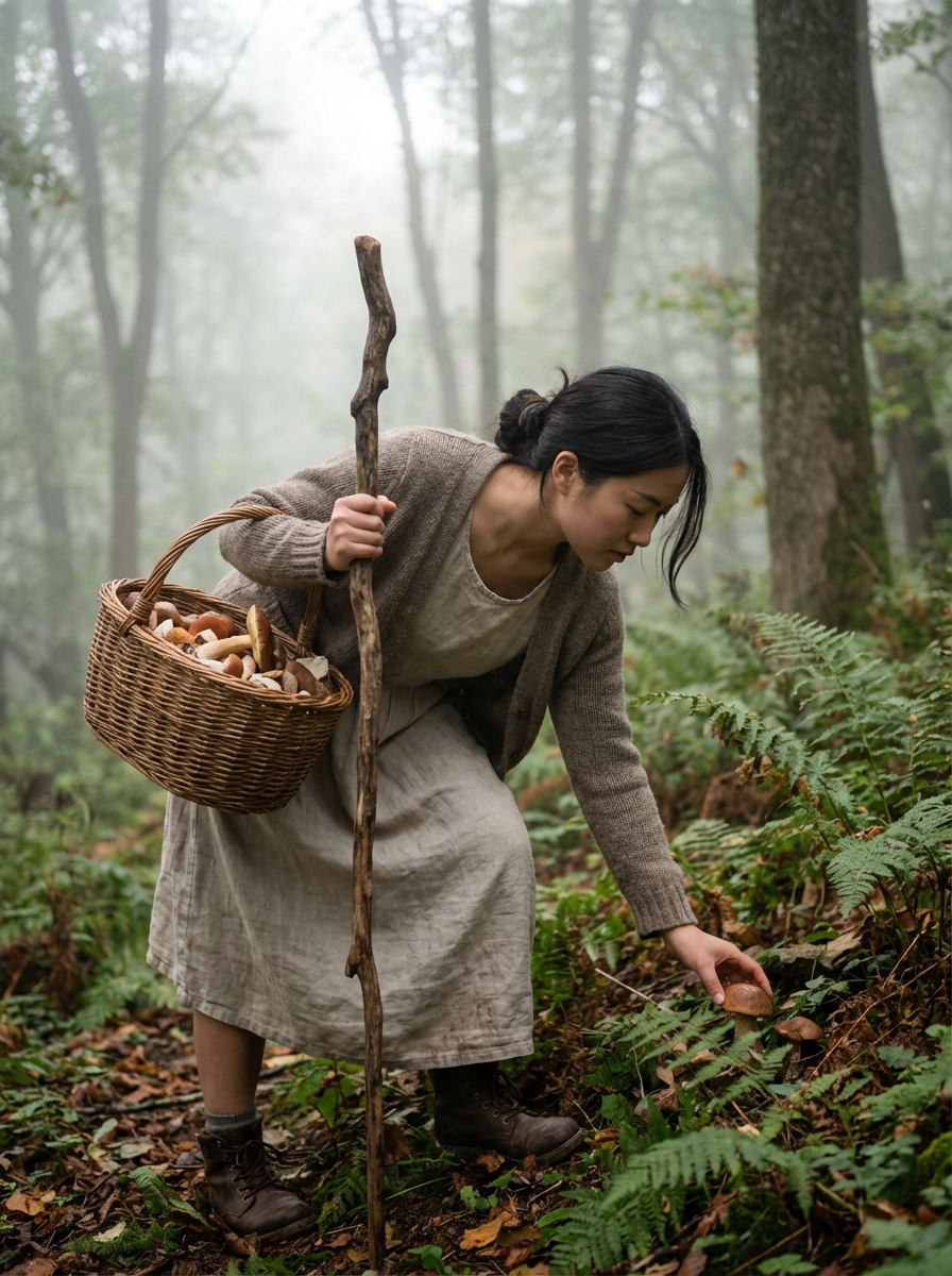 model foraging mushrooms, cottagecore aesthetic, basket and walking stick, misty forest morning