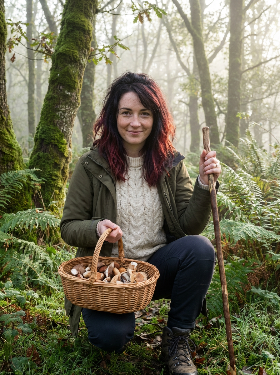 model foraging mushrooms, cottagecore aesthetic, basket and walking stick, misty forest morning
