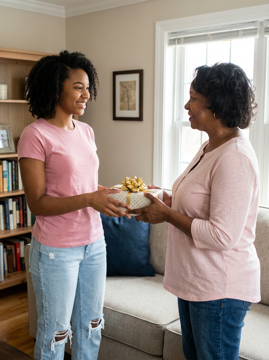 model giving gift to mother figure, wrapped present with bow, loving interaction, home setting