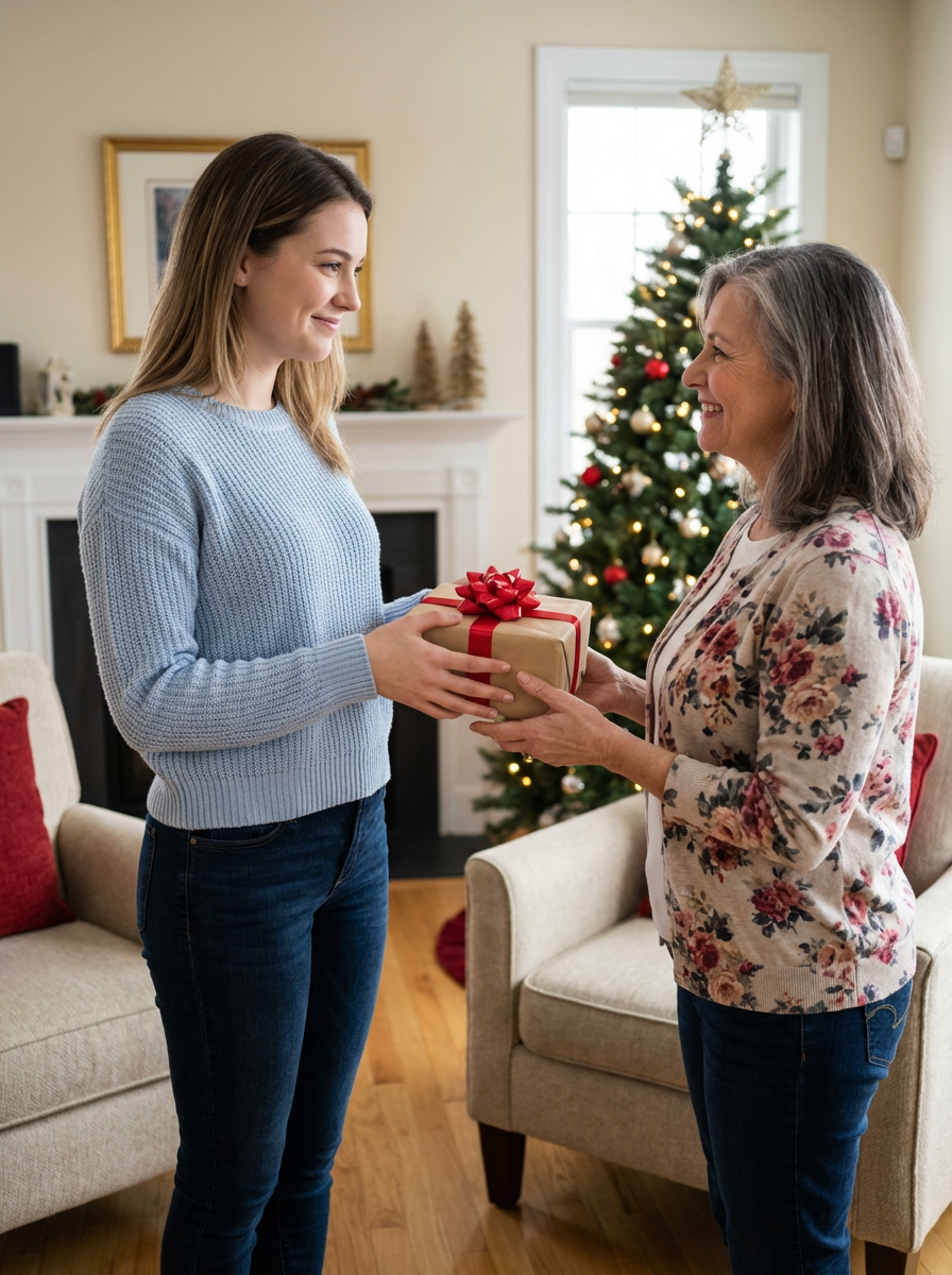 model giving gift to mother figure, wrapped present with bow, loving interaction, home setting