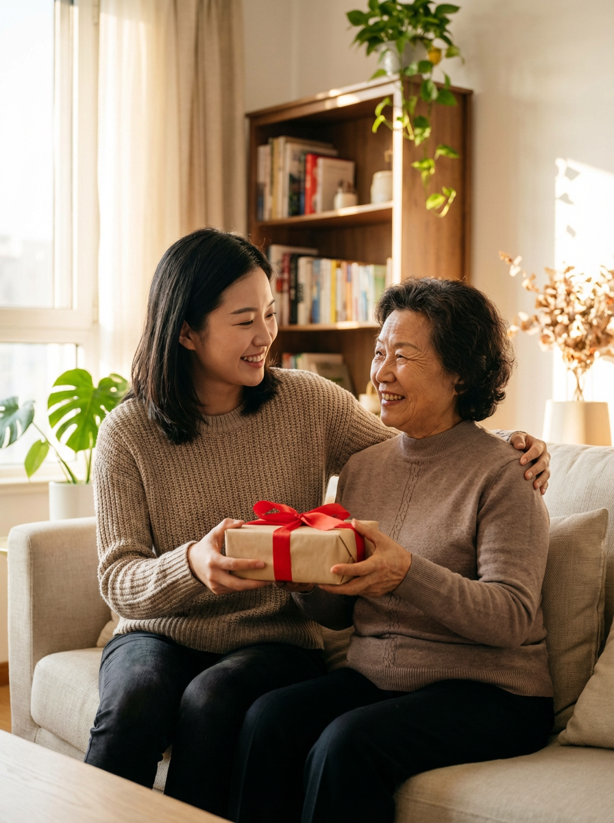 model giving gift to mother figure, wrapped present with bow, loving interaction, home setting