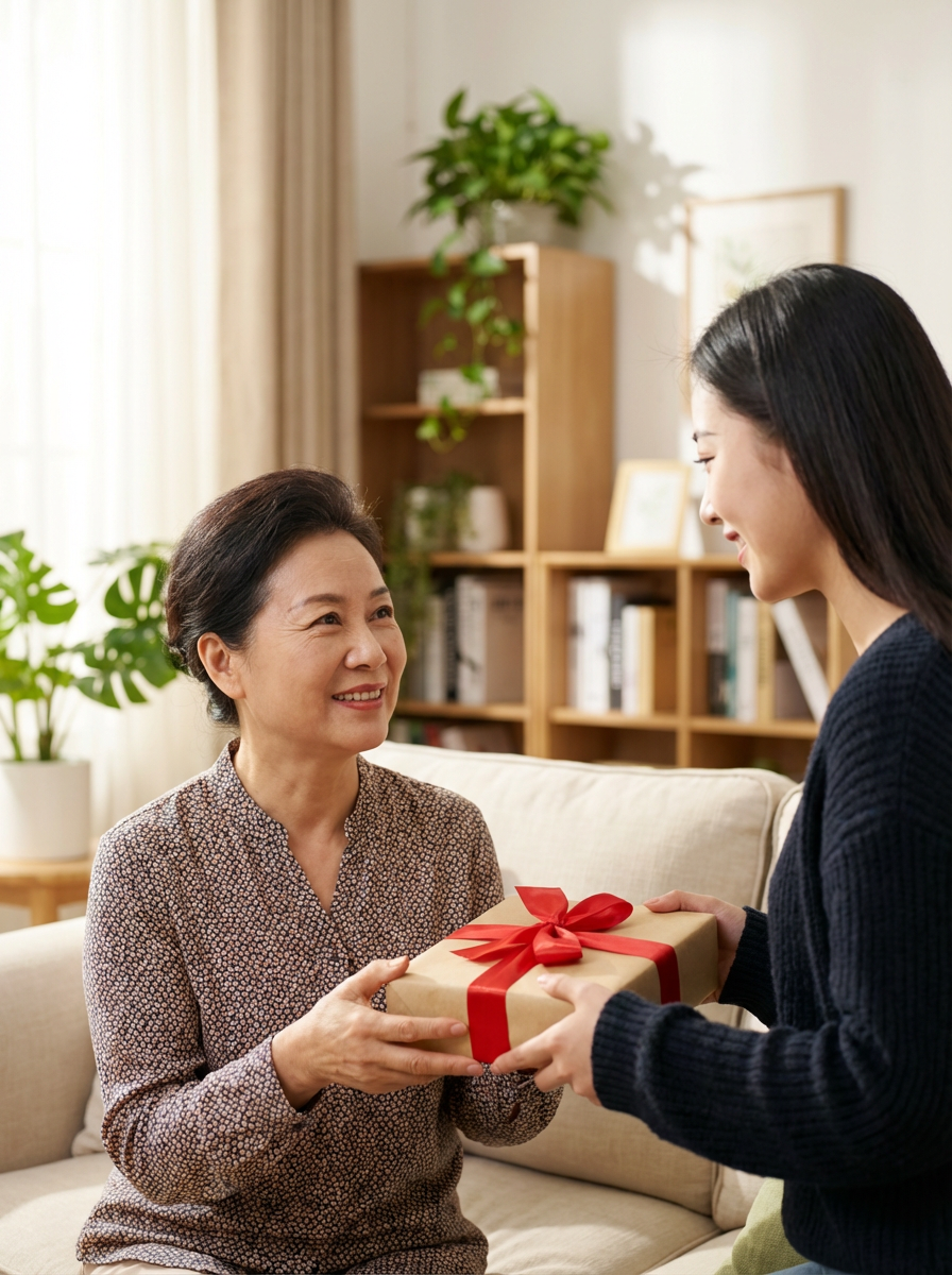 model giving gift to mother figure, wrapped present with bow, loving interaction, home setting