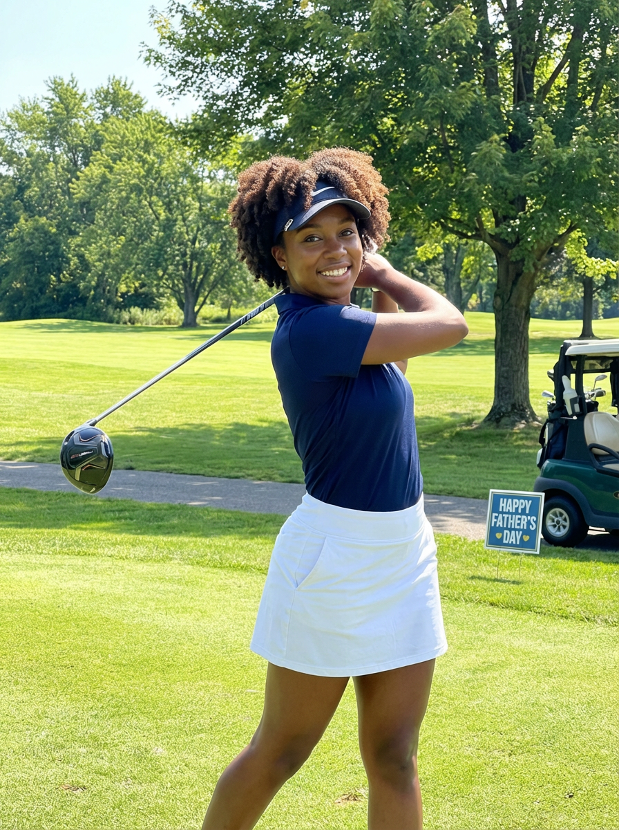 model golfing, Fathers Day activity, golf course background, sporty casual attire, sunny day