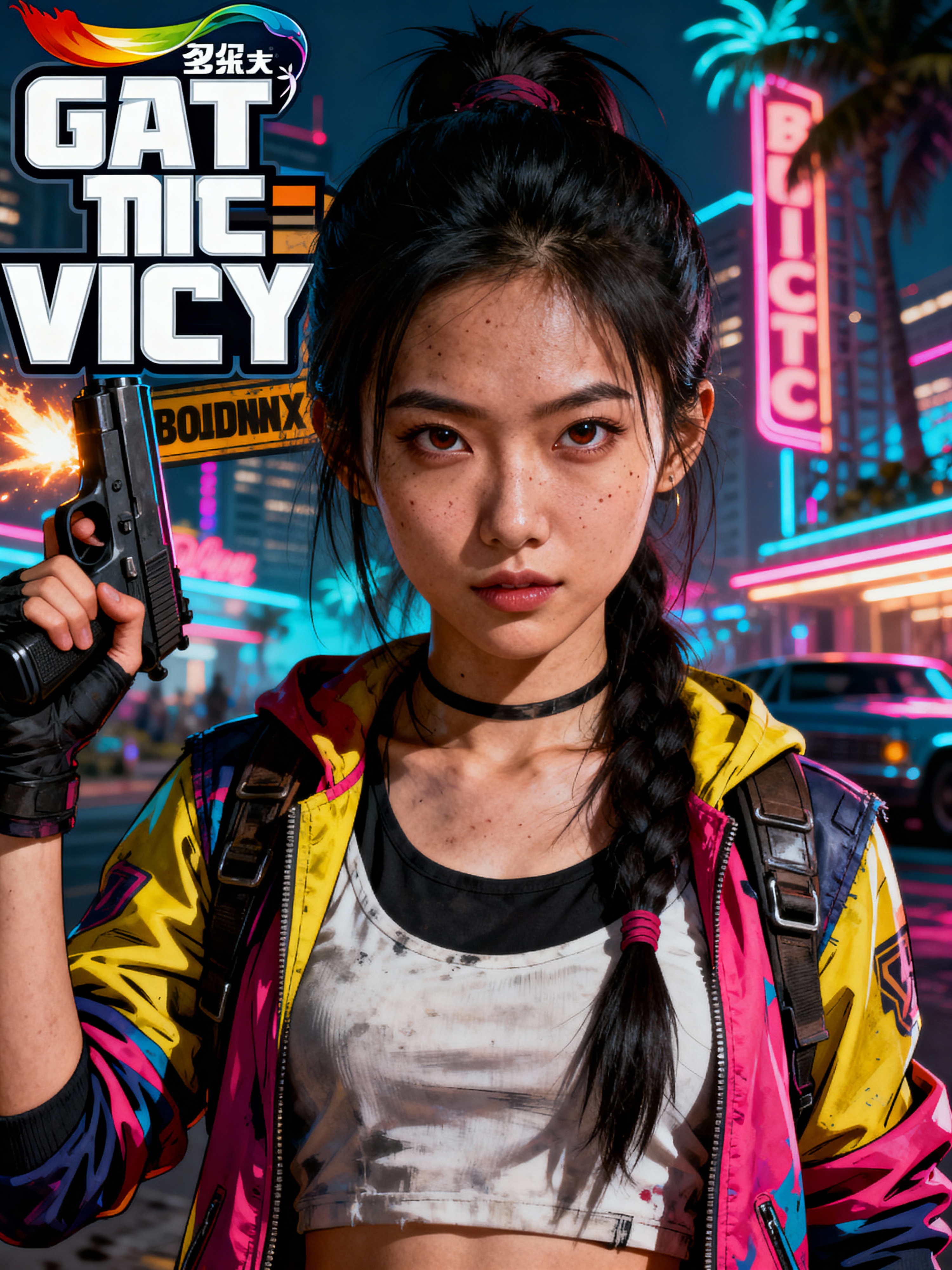 model, gta vice city cover art, borderlands style, celshading, trending on artstation, by rhads, andreas rocha, rossdraws, makoto shinkai, laurie greasley, lois van baarle, ilya kuvshinov and greg rutkowski