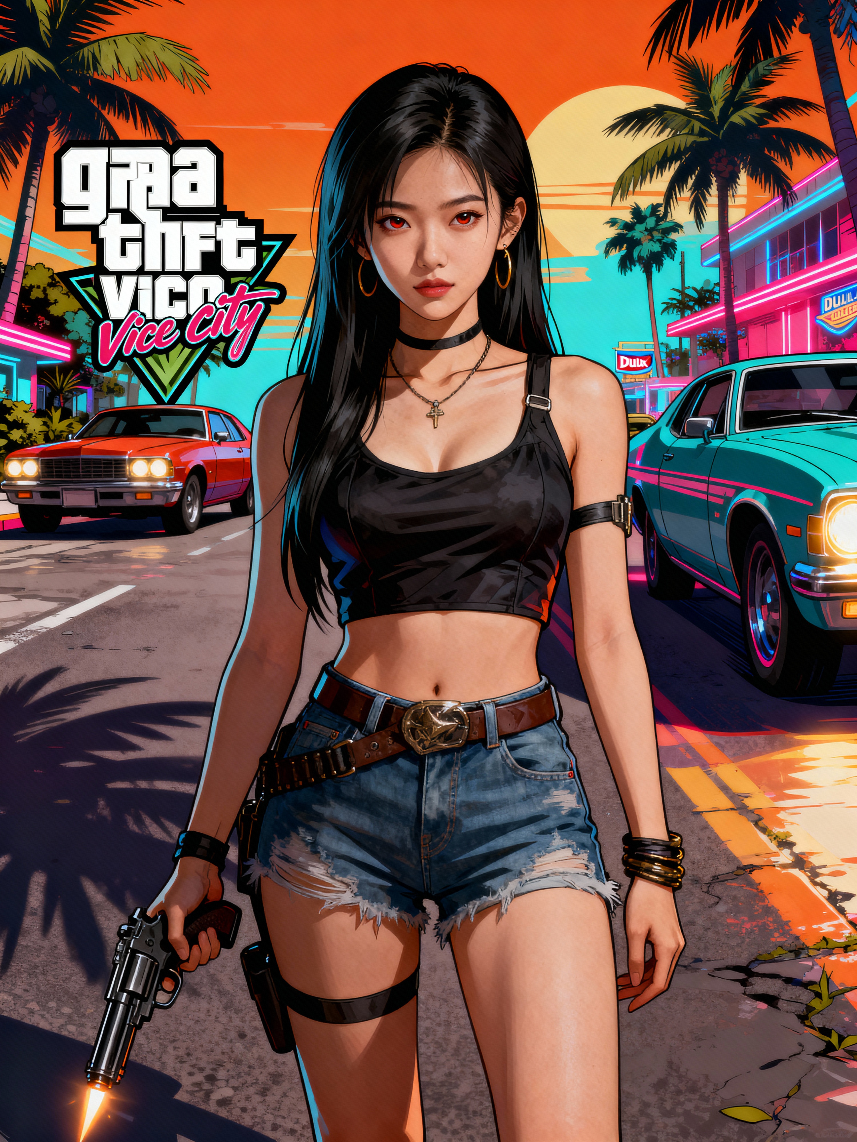 model, gta vice city cover art, borderlands style, celshading, trending on artstation, by rhads, andreas rocha, rossdraws, makoto shinkai, laurie greasley, lois van baarle, ilya kuvshinov and greg rutkowski