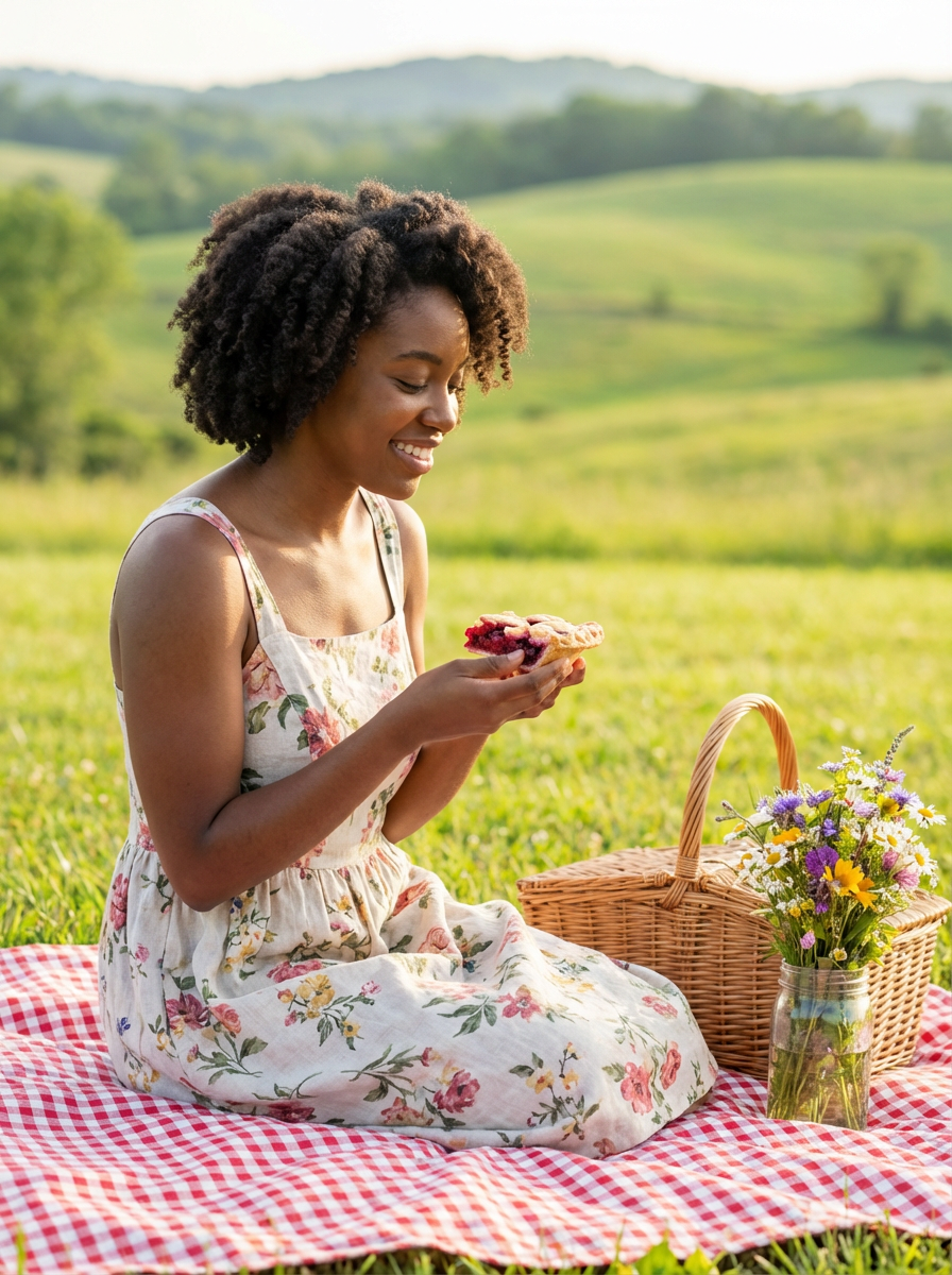 model having cottagecore picnic, gingham blanket, homemade pie, wildflower bouquet, pastoral countryside