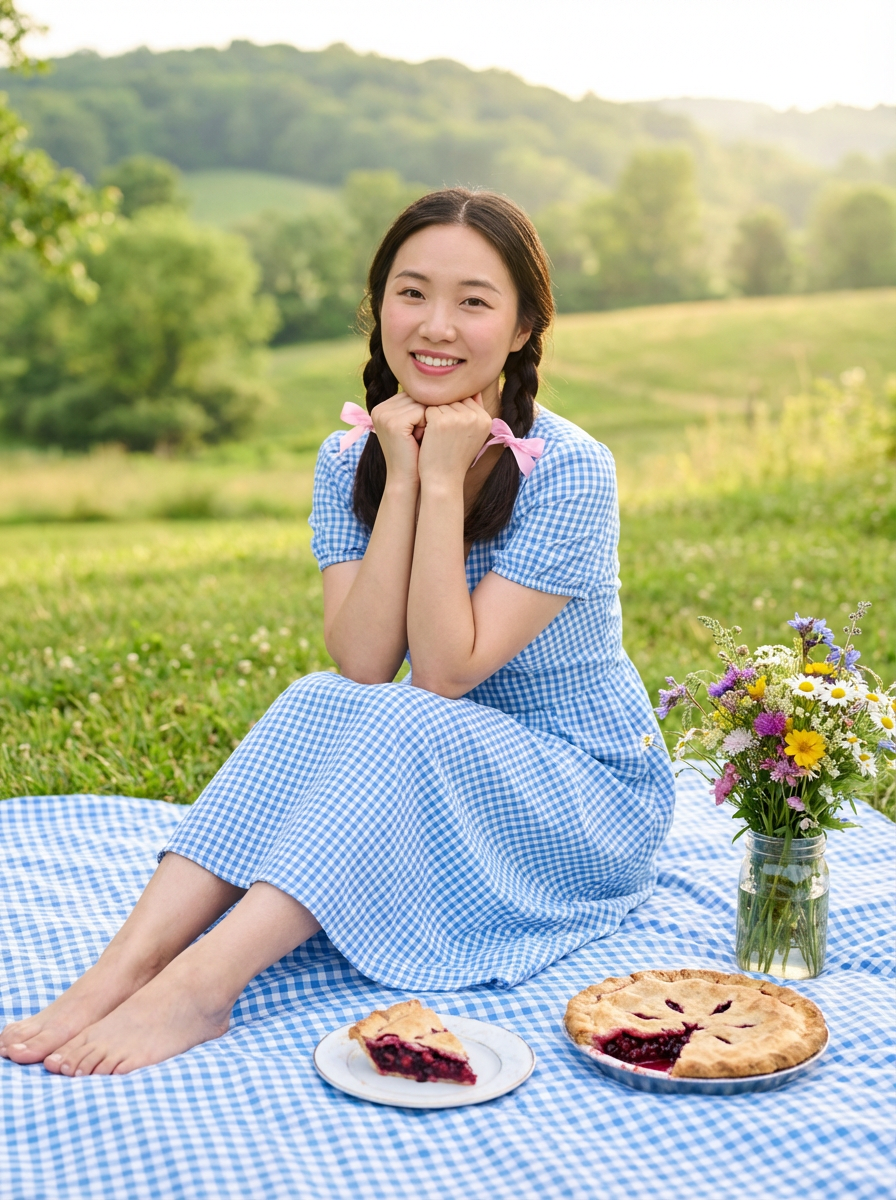 model having cottagecore picnic, gingham blanket, homemade pie, wildflower bouquet, pastoral countryside