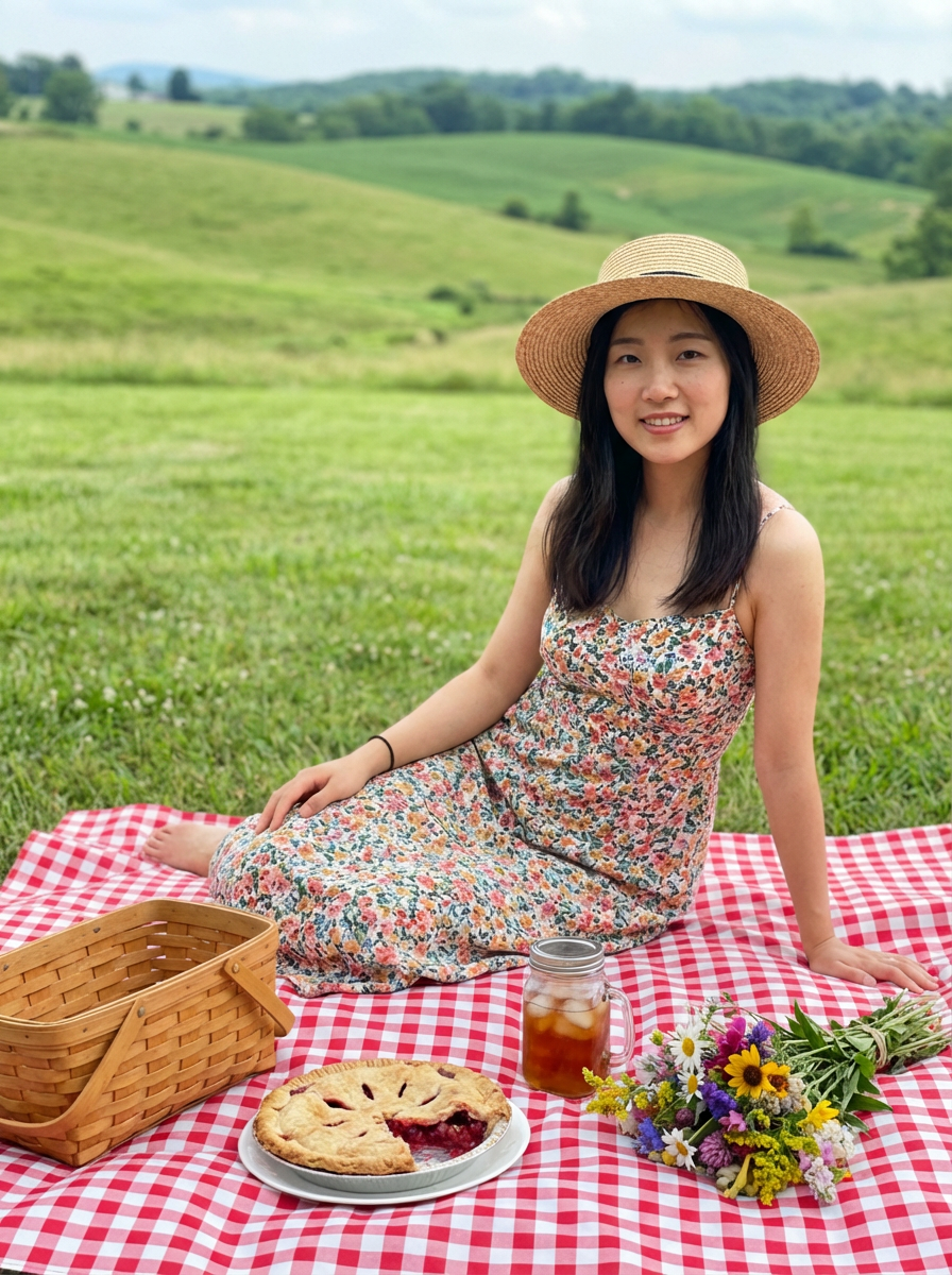model having cottagecore picnic, gingham blanket, homemade pie, wildflower bouquet, pastoral countryside
