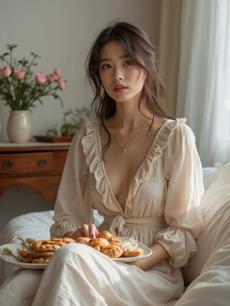 model having picnic in bedroom, wearing flowy linen dress , fresh pastries and flowers on vintage tray, soft natural lighting, dreamy aesthetic