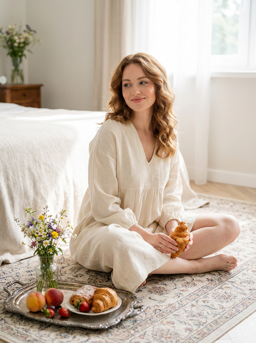 model having picnic in bedroom, wearing flowy linen dress , fresh pastries and flowers on vintage tray, soft natural lighting, dreamy aesthetic