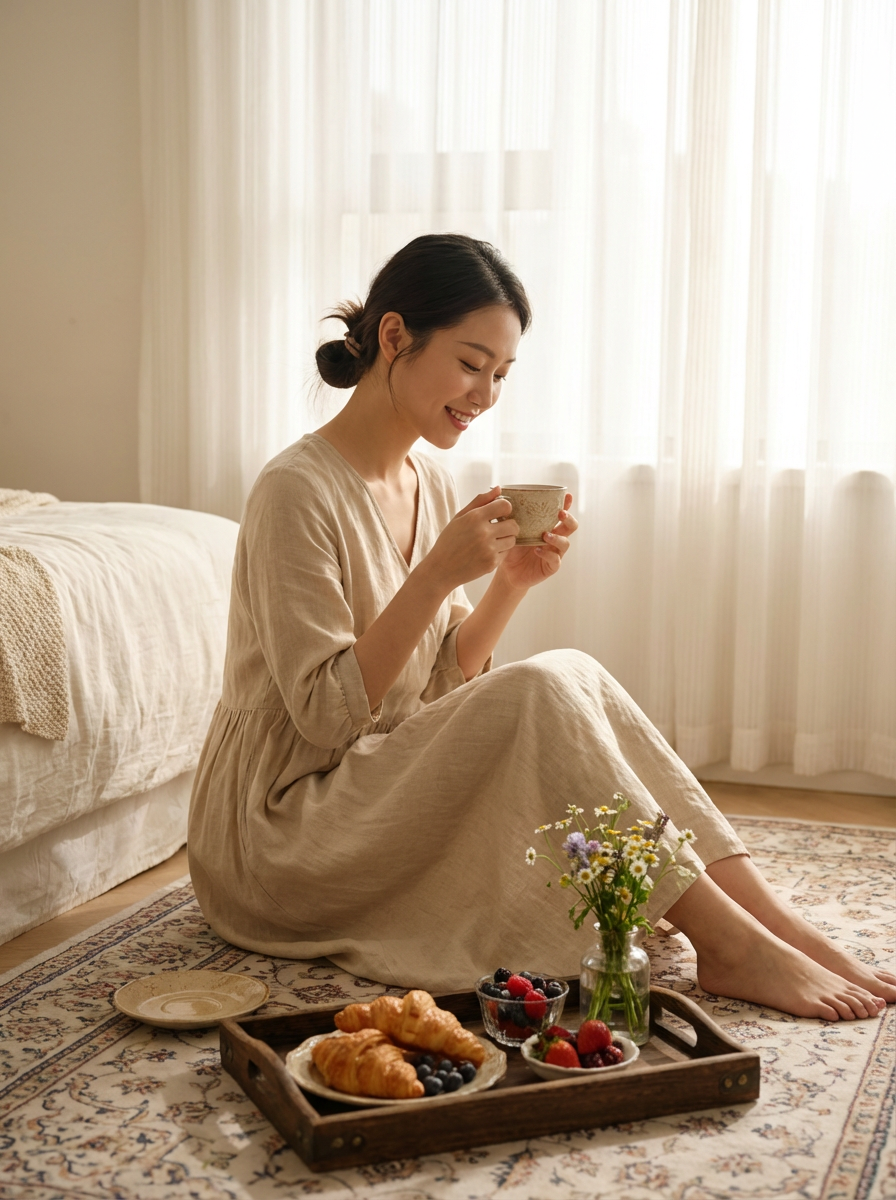 model having picnic in bedroom, wearing flowy linen dress , fresh pastries and flowers on vintage tray, soft natural lighting, dreamy aesthetic