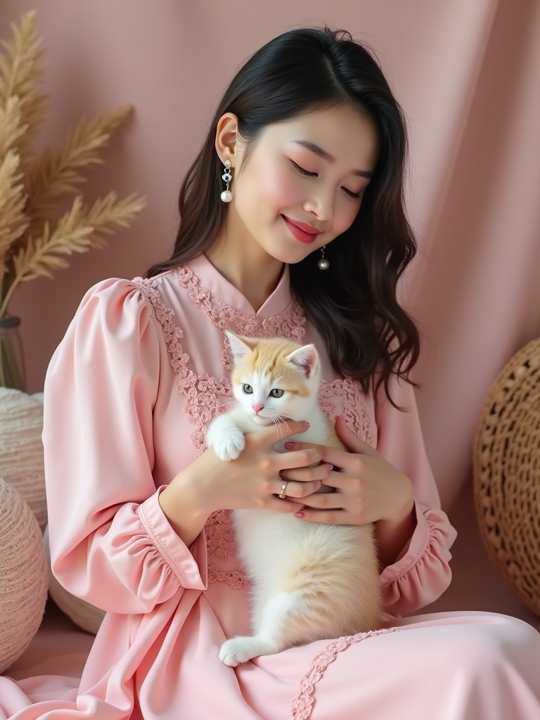 model holding a cat or pet on their lap, wearing a cute pink dress with pearl earrings , surrounded by picnic decor, soft pink theme