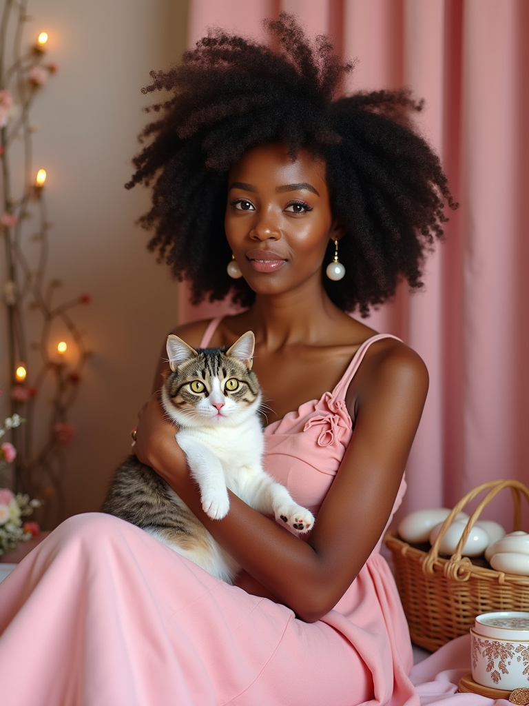 model holding a cat or pet on their lap, wearing a cute pink dress with pearl earrings , surrounded by picnic decor, soft pink theme