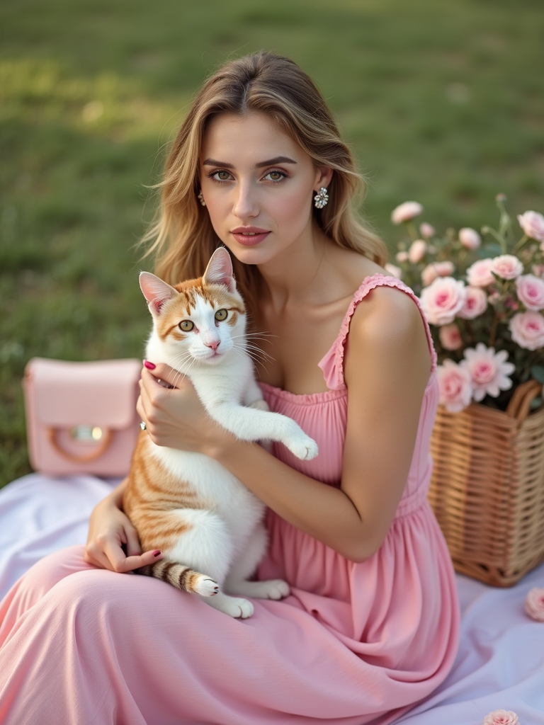 model holding a cat or pet on their lap, wearing a cute pink dress with pearl earrings , surrounded by picnic decor, soft pink theme