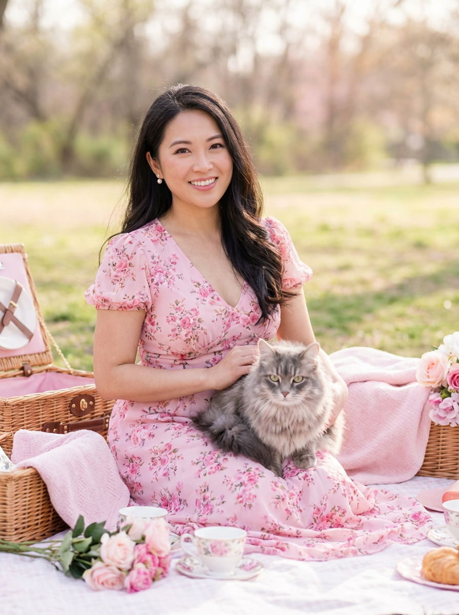 model holding a cat or pet on their lap, wearing a cute pink dress with pearl earrings , surrounded by picnic decor, soft pink theme