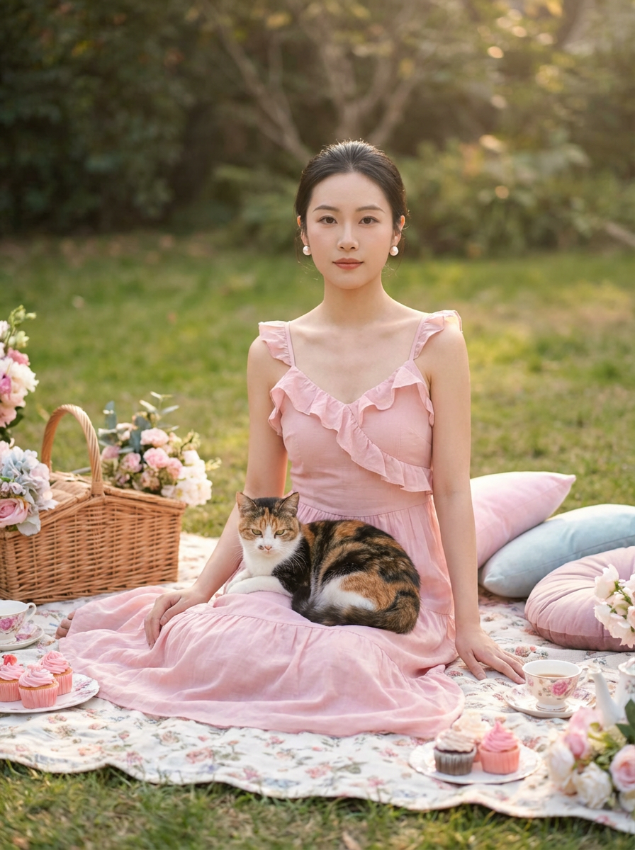 model holding a cat or pet on their lap, wearing a cute pink dress with pearl earrings , surrounded by picnic decor, soft pink theme