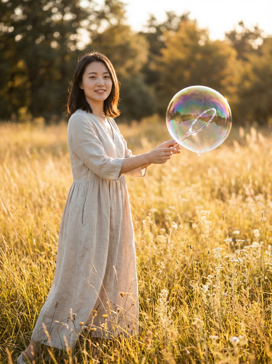 model holding a giant soap bubble in a sunlit field