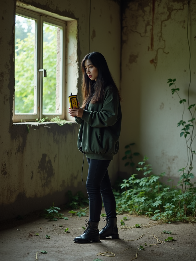 model holding a handheld small yellow geiger counter in desolate abandoned rusty building with overgrown nature. wearing black boots and black pants.