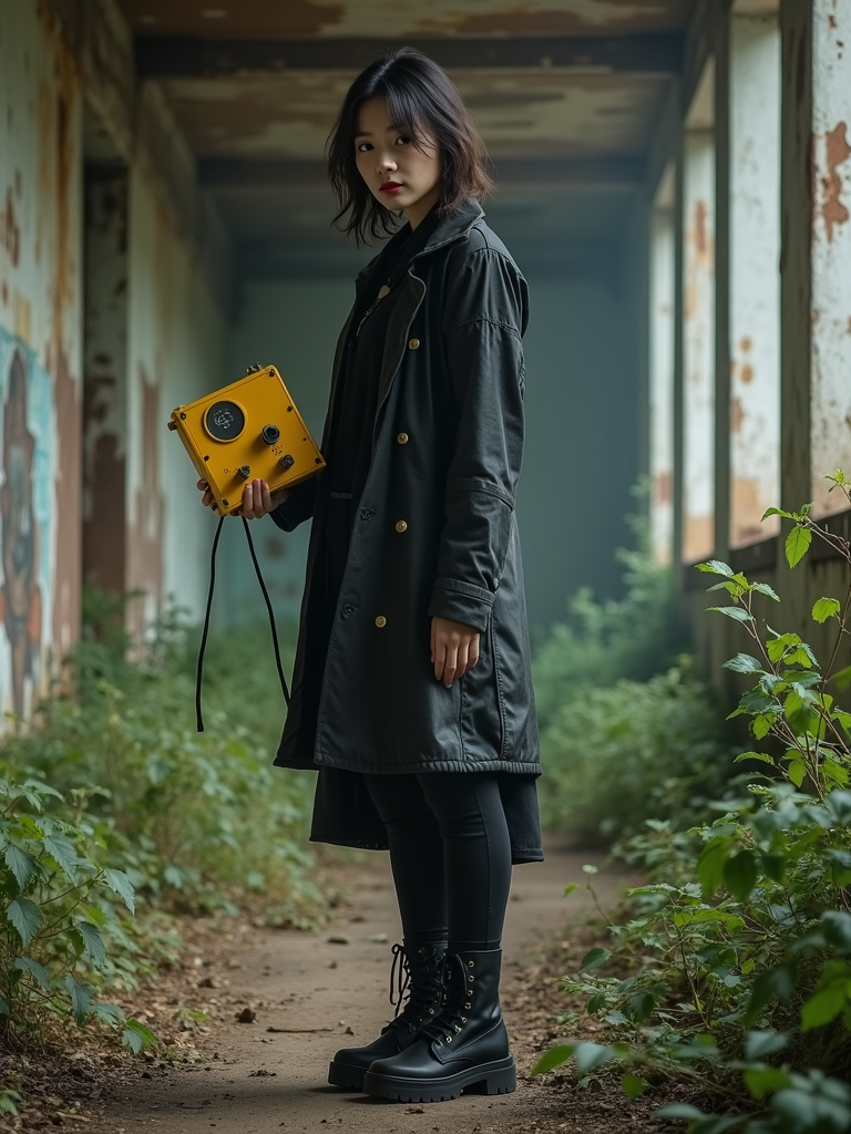 model holding a handheld small yellow geiger counter in desolate abandoned rusty building with overgrown nature. wearing black boots and black pants.