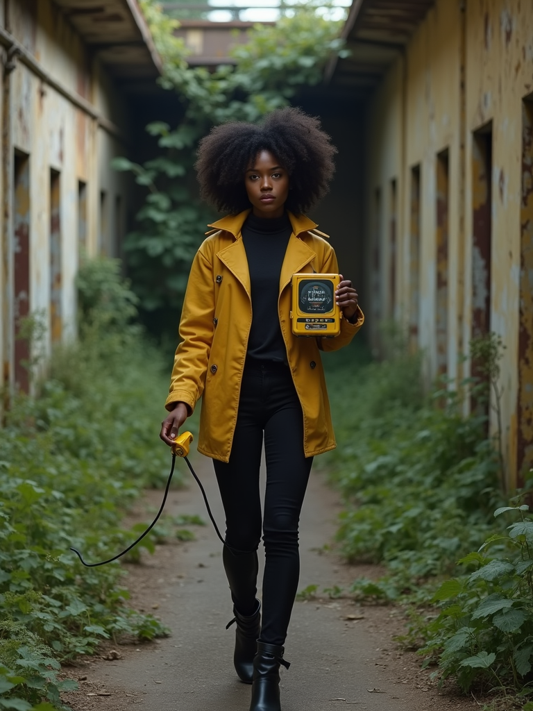 model holding a handheld small yellow geiger counter in desolate abandoned rusty building with overgrown nature. wearing black boots and black pants.