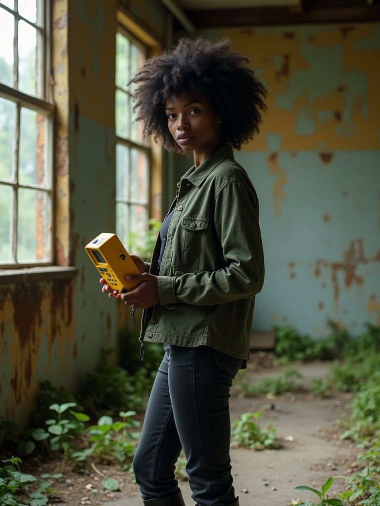 model holding a handheld small yellow geiger counter in desolate abandoned rusty building with overgrown nature. wearing black boots and black pants.