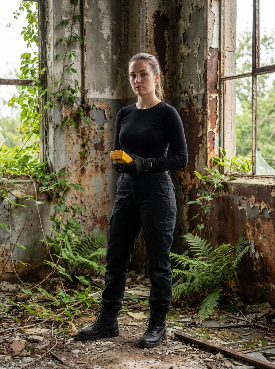 model holding a handheld small yellow geiger counter in desolate abandoned rusty building with overgrown nature. wearing black boots and black pants.