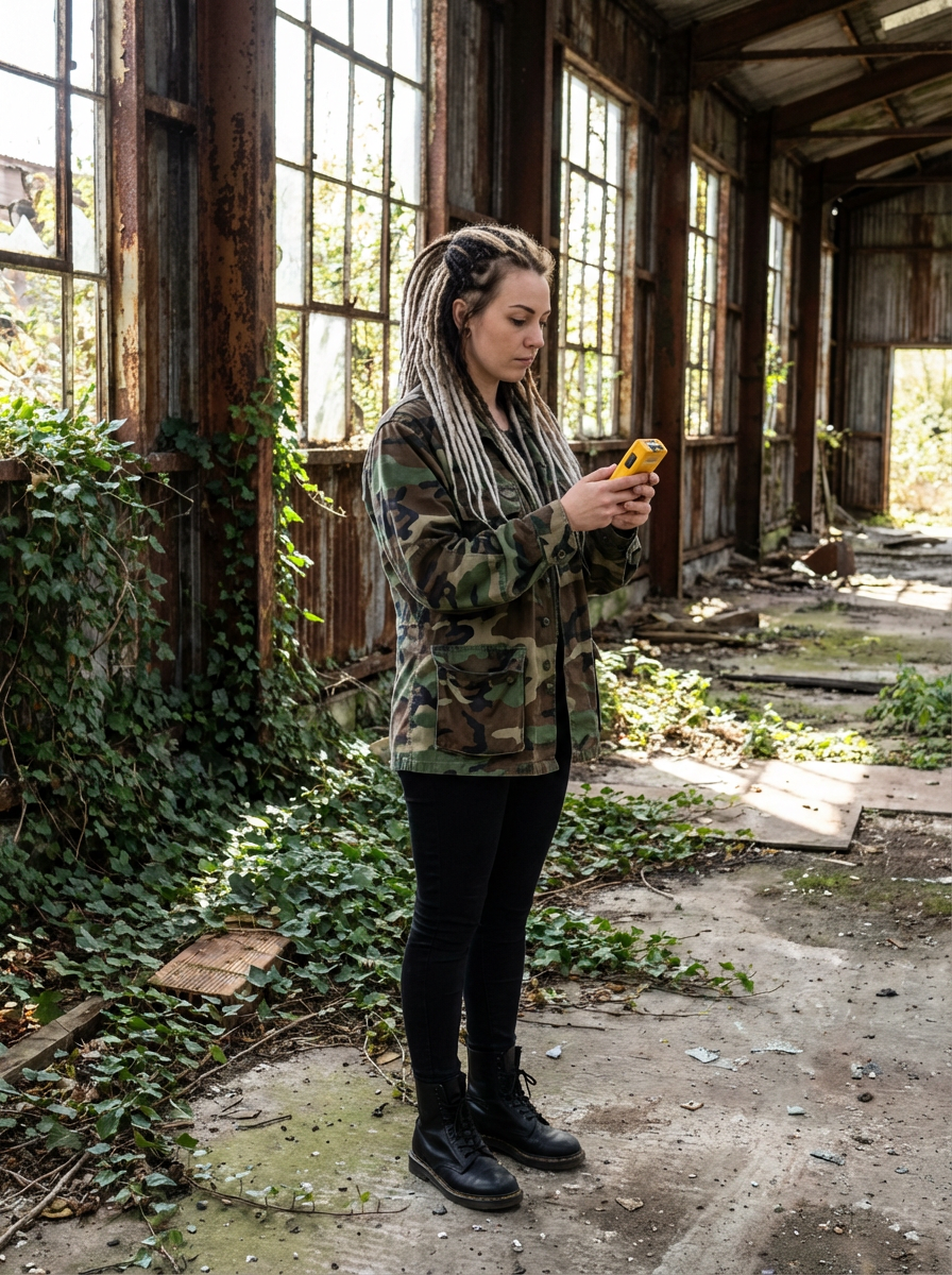 model holding a handheld small yellow geiger counter in desolate abandoned rusty building with overgrown nature. wearing black boots and black pants.