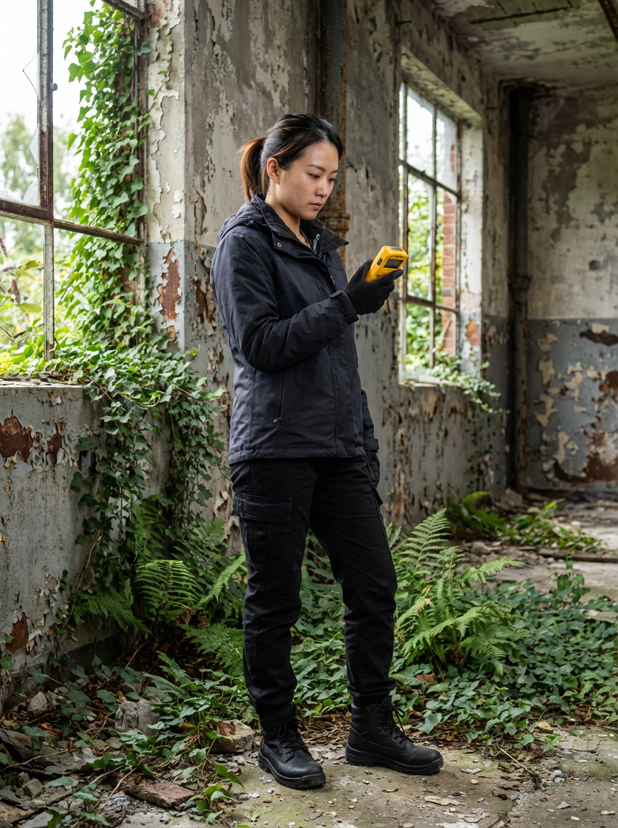 model holding a handheld small yellow geiger counter in desolate abandoned rusty building with overgrown nature. wearing black boots and black pants.
